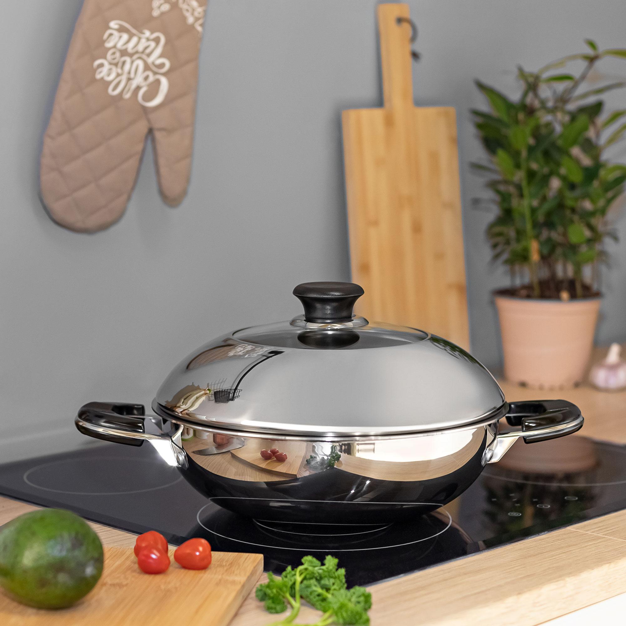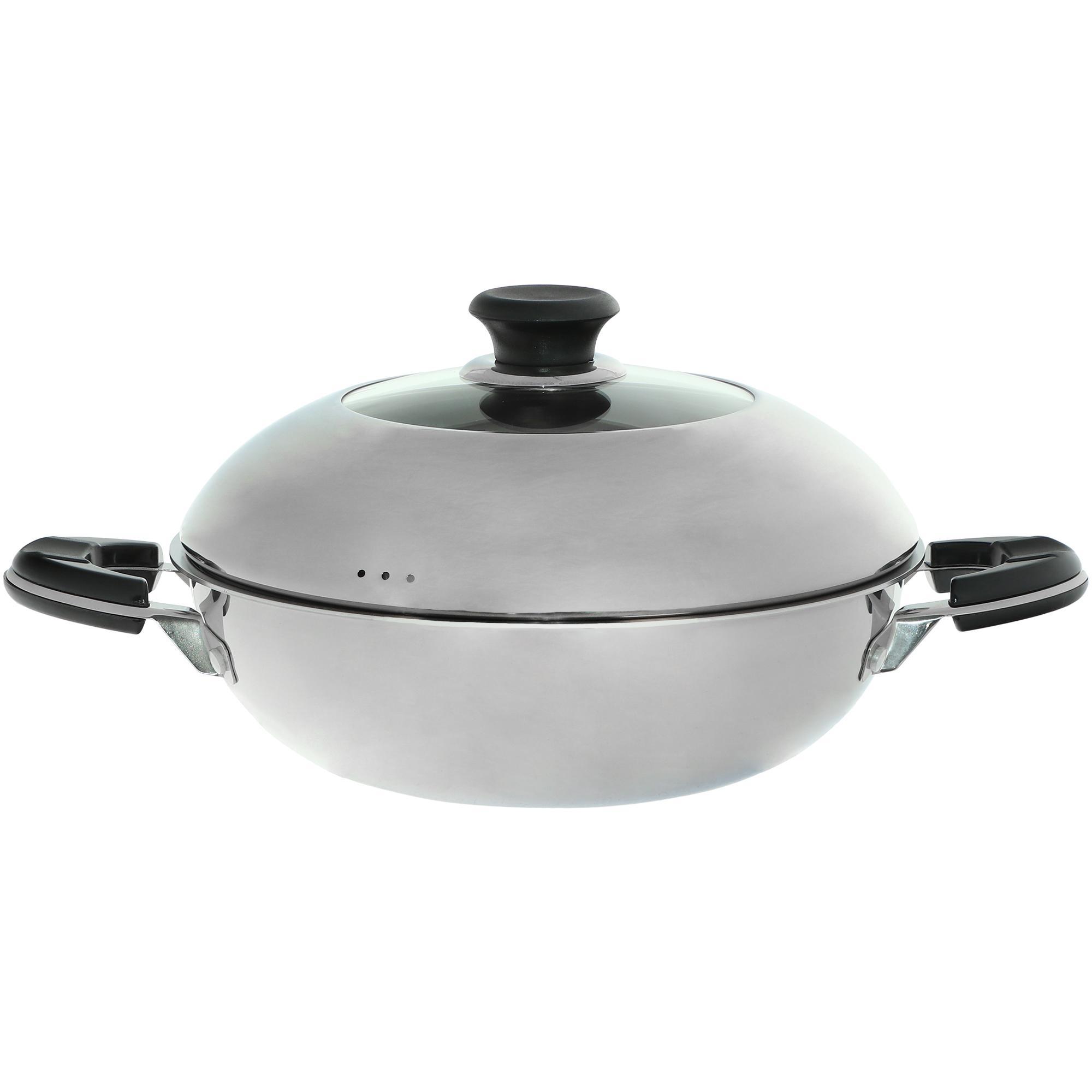 Вок бренда Vantage изготовлен из нержавеющей стали, благодаря чему, несмотря на высокий уровень прочности и долговечности, он легок и не требует особого ухода. Трехслойные толстые стенки и дно с внутренней прослойкой из алюминия гарантируют отсутствие деформации и сильного перегрева. Стальная крышка со стеклянной вставкой и пластиковые держатели в ручках добавляют эргономичности и удобства во время готовки.
