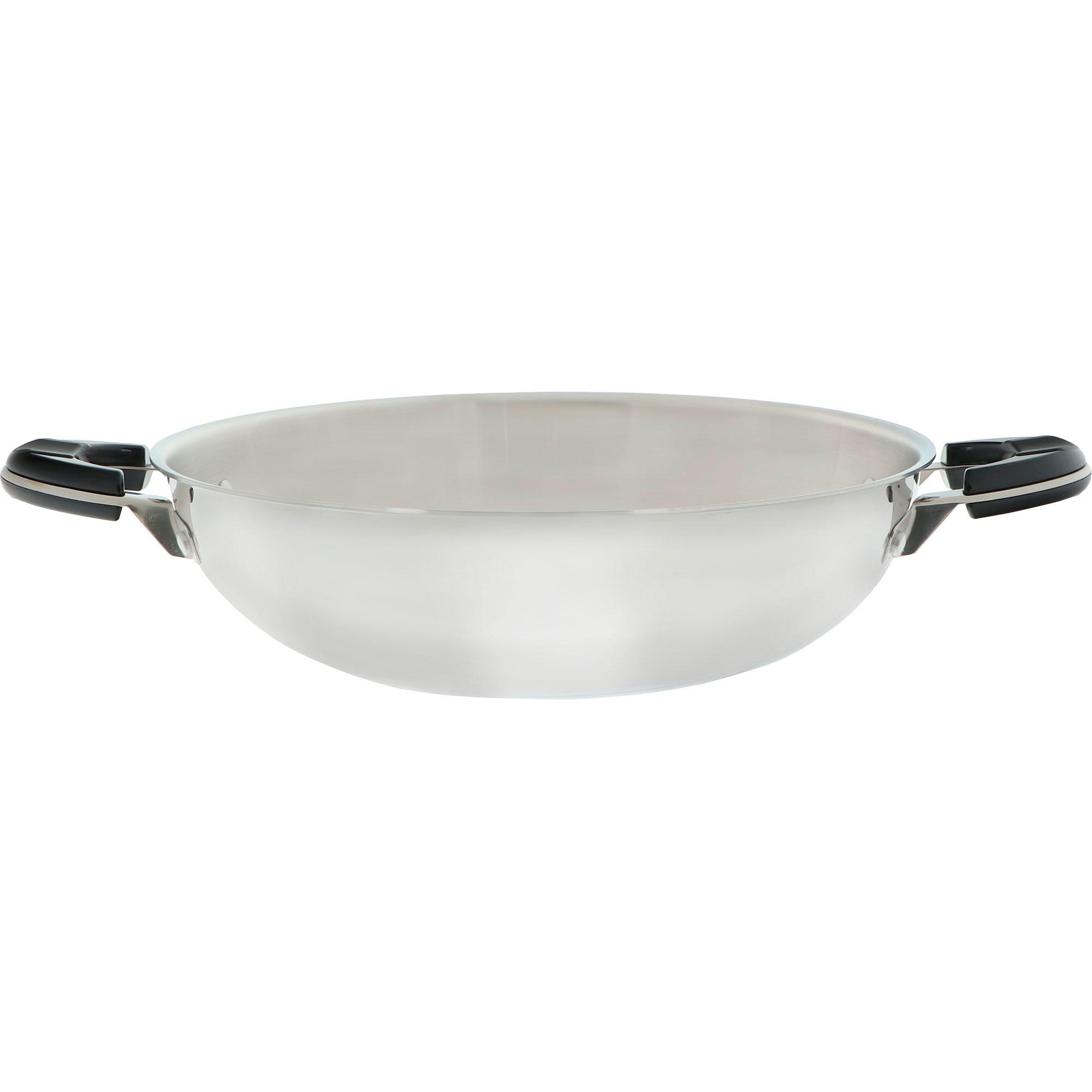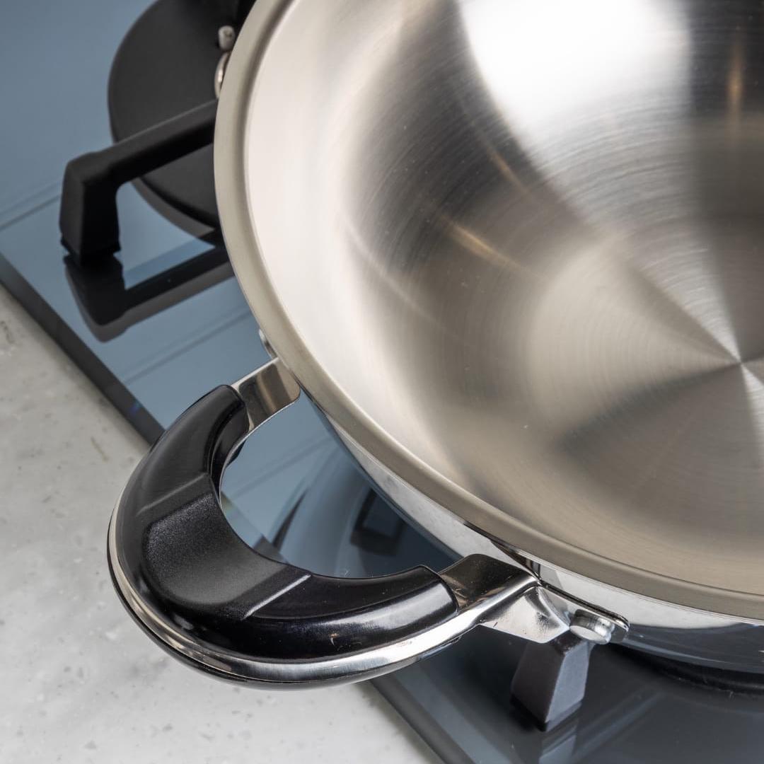 Вок бренда Vantage изготовлен из нержавеющей стали, благодаря чему, несмотря на высокий уровень прочности и долговечности, он легок и не требует особого ухода. Трехслойные толстые стенки и дно с внутренней прослойкой из алюминия гарантируют отсутствие деформации и сильного перегрева. Стальная крышка со стеклянной вставкой и пластиковые держатели в ручках добавляют эргономичности и удобства во время готовки.