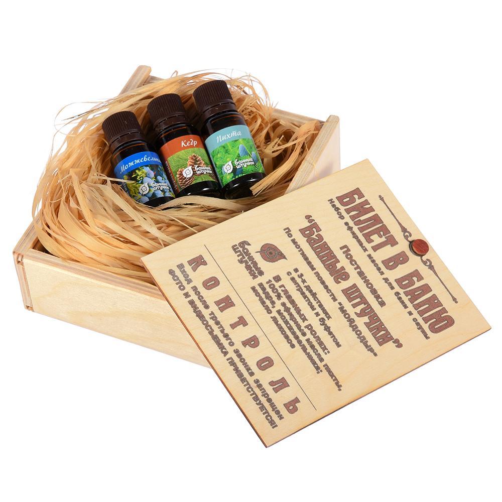 Приятный набор эфирных масел Банные Штучки Билет в баню 3х15 мл 32158. Незаменимый предмет традиционной русской бани и сауны. Ароматная жидкость устраняет головную боль, способствует расслаблению, а также улучшению самочувствия и настроения. Для применения достаточно добавить в ковш 10-15 капель на 15 м2. Затем на стены, полки и слегка остывшие камни необходимо плеснуть натуральное эфирное масло, чтобы распространить аромат по всему помещению. Рекомендуется повторить процедуру несколько раз.
