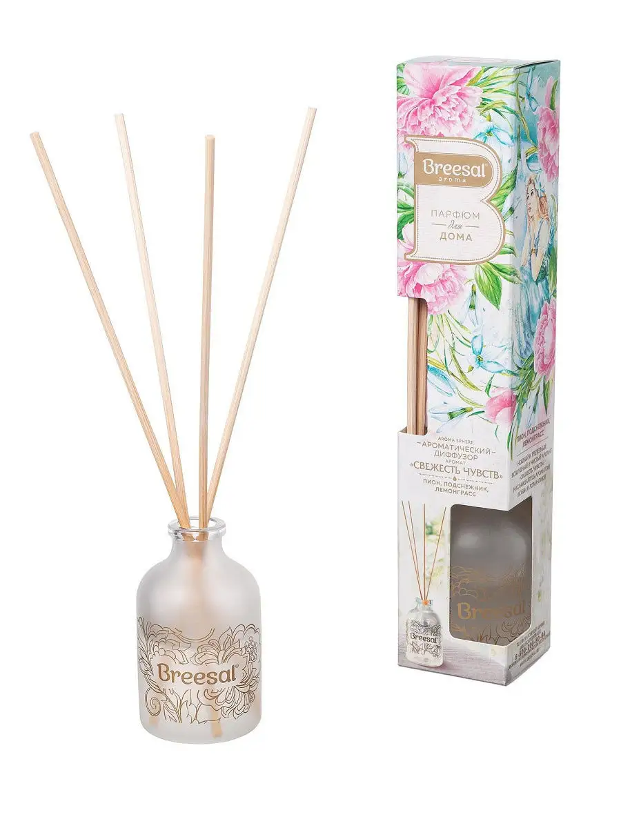 Диффузор ароматический для дома Breesal – это многогранный аромат в стеклянном флаконе с натуральными древесными палочками, который впишется в любой интерьер и создаст в нем особую атмосферу. Легкая и трепетная композиция «Свежесть чувств» подарит уют и гармонию приближающейся весны: теплые ноты пиона напомнят о солнце, тонкий аромат подснежника разбудит сердце, а лемонграсс завершит аккорд сочным послевкусием. Просто откройте флакон и опустите палочки в ароматический диффузор для дома. Сделанные из натурального ротанга, они быстро наполнятся жидкостью и будут отдавать аромат медленно и равномерно, поэтому вы сможете наслаждаться им до 30 дней. Регулировать интенсивность ароматизатора для дома можно добавлением или уменьшением количества палочек. А если аромат станет менее ощутим, достаточно перевернуть палочки во флаконе аромадиффузора.