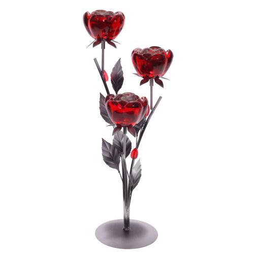 Небольшой и очень красивый декоративный подсвечник для трех свечей. Привлекательное сочетание элементов из метала и красного стекла. Данный подсвечник подойдет для свечей диаметром 4 см.