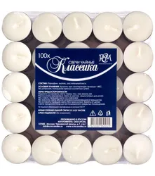 Набор чайных свечей 100 штук без запаха. Высота свечей - 15 мм. Диаметр свечи - 38 мм. В данных свечах длинный ФИТИЛЬ, для широкого применения свечей, этот фитиль не нужно подрезать, если Вам нужно активное горение свечи, с данным длинным фитилем - свеча горит 2 часа 25 минут, но если Вам нужно спокойное и долгое горение, подрежьте ФИТИЛЬ, время горения будет от 3 до 4 часов.