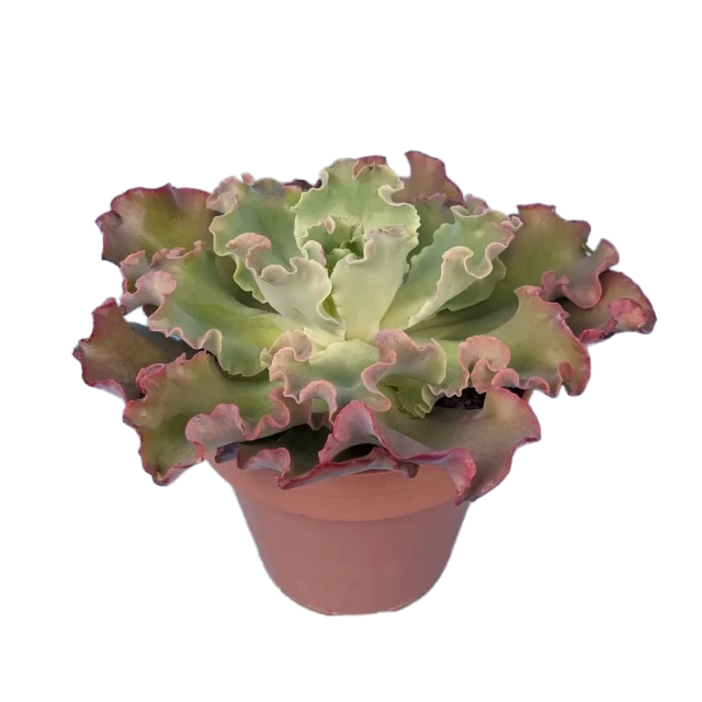 Представляет собой миниатюрный куст, с округлыми утолщенными листьями, растущими от короткого толстого стебля в форме розетки. Листья хорошо ветвятся и имеют своеобразный волнистый край с оранжевой окантовкой. Цвет листьев нежный, салатный. Сверху лист слегка опушен и имеет восковой налёт.