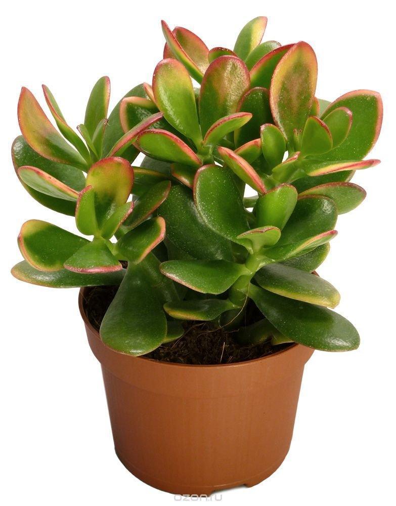 Крассула овата Сансет (Crassula ovata Sunset) – красивый суккулент, обладающий объемной кроной, состоящей из множества овальных, сужающихся у основания и острых на кончиках мясистых листьев. Растение имеет особые цвета, напоминающие закат, и по этой причине оно очень ценится любителями суккулентных растений. Его блестящие листья, типичной обратнояйцевидной формы, зеленого цвета с охристым и медно-красным оттенком по краям, которые усиливаются при воздействии солнца или сухого холода. Цветение происходит поздней осенью, когда появляются гроздья мелких белых цветков с оттенков лаванды в форме звездочек в верхушечном соцветии.