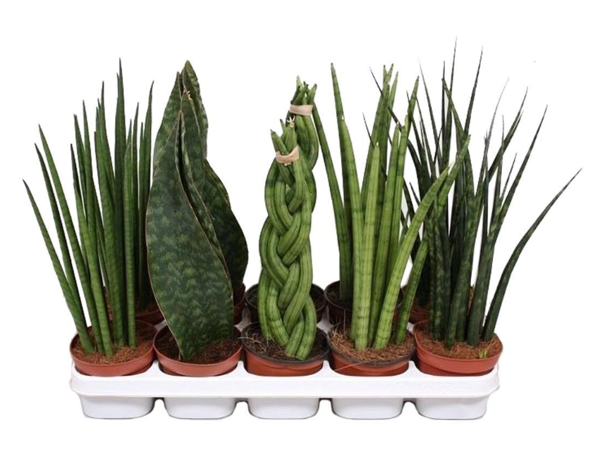 Сансевиерия Микс (Sansevieria Mix) - в миксе собрана коллекция востребованных сансевиерий схожих по внешнему виду. Отличается микс большими жесткими мечевидными и прямостоячими листьями насыщенно- зелёного цвета, образующими пышную розетку. На темно-зеленом фоне выделяются более светлые неравномерные полосы, у молодых растений наиболее яркие оттенки. Листья прикорневые, прямостоящие, шириной в 5-6 см и могут достигать длины до 45 см. Микс пользуется популярностью у покупателей, уступая по декоративности лишь пестролистным видам. Эта неприхотливая сансевиерия подойдет даже неопытным цветоводам и украсит интерьер любого помещения.