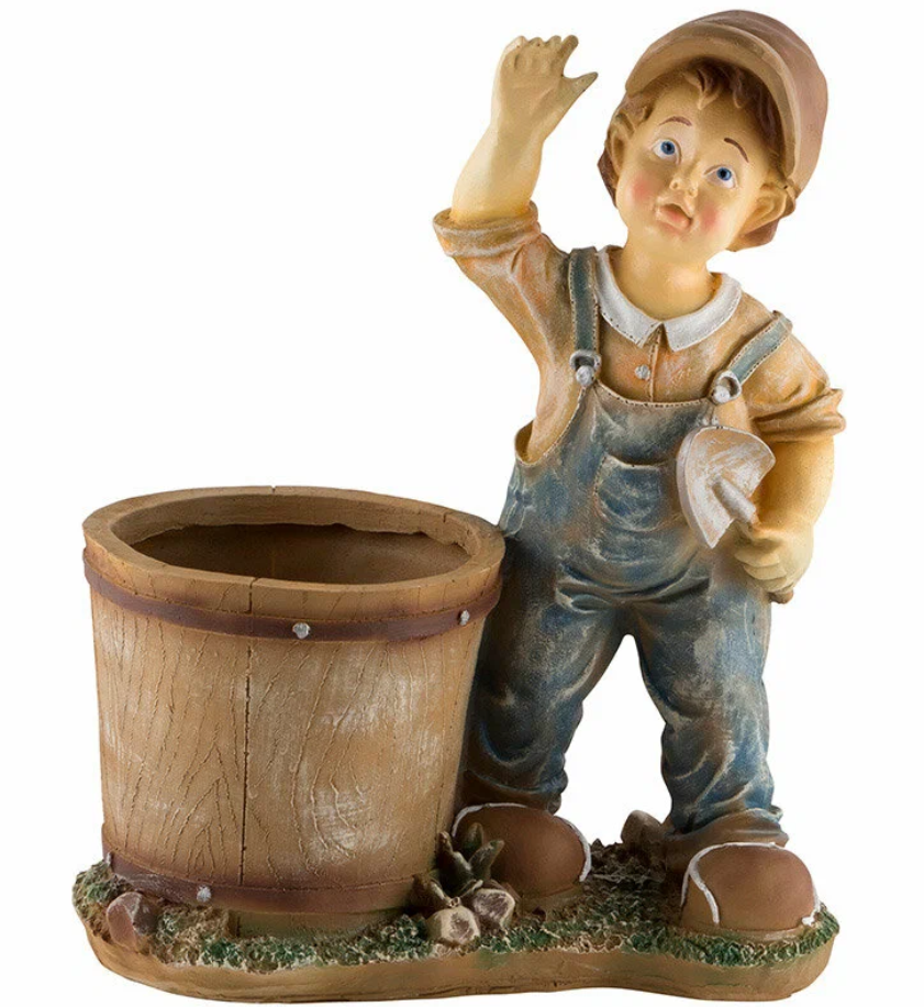 Кашпо " Мальчик с совочком" Н-45см Фигура садовая - кашпо Материал: полистоун Размер: 36*20*45 см Индивидуальная упаковка: стикер Правила ухода: при необходимости удалять пыль сухой мягкой тканью. В случае необходимости промыть водой без применения абразивных чистящих средств.