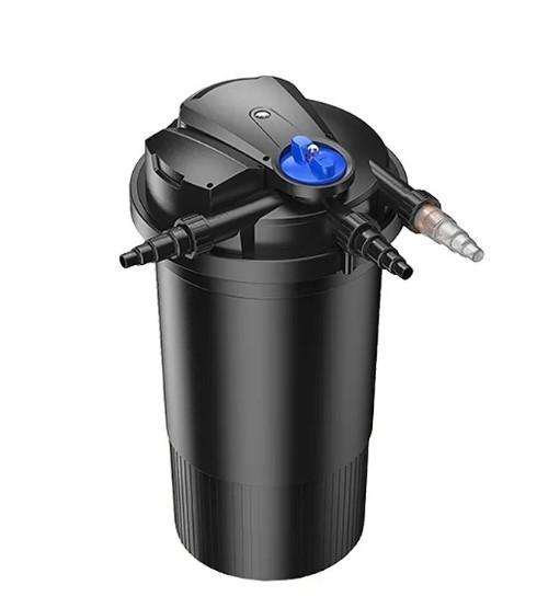 Напорный фильтр CPA-20000 обеспечивает комплексную очистку пруда объемом до 40 м3 без рыбы и 20 м3 с рыбой. Благодаря данному устройству в водоёме значительно сокращается количество водорослей, вредных веществ, улучшается состояние микрофлоры, восстанавливается биобаланс, создается благоприятная среда для обитателей пруда. Фильтрация осуществляется в три этапа:1. Механическая очистка -устройство оснащено специальными губками, которые задерживают крупные частицы грязи.2. Ультрафиолетовая обработка - в фильтр встроен стерилизатор, который убивает вредные бактерии и микроорганизмы, а также уничтожает водоросли, которые оседают на губках.3. Биологическая очистка --происходит, когда вода проходит в нижней части фильтра, куда помещаются био шарики для заселения полезных бактерий.- Размер фильтра 450х450х550 мм- Мощность встроенной УФ лампы 36 Вт- Объём фильтра 50 л- Производительность 12000 л/ч- Комплект штуцеров 32/38/50 мм. Насос и шланги в комплект не входят.