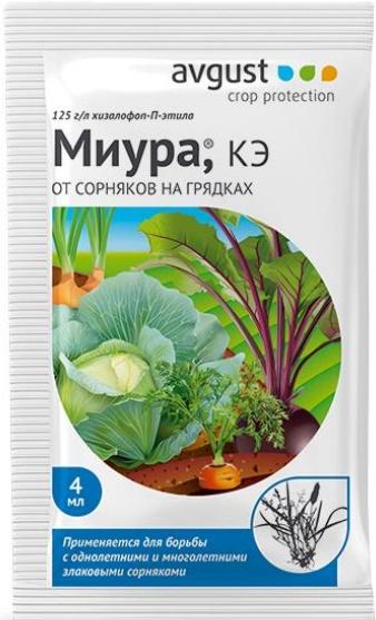 Средство для борьбы с сорняками на овощных культурах Avgust Миура КЭ ампула 4 мл A00478 - избирательный гербицид для уничтожения однолетних и многолетних злаковых сорняков. Эффект заметен уже через 7-10 дней после применения. Полная гибель сорной растительности наступает через 1-3 недели в зависимости от вида сорняков и погодных условий. Применение: опрыскивание растений рабочей жидкостью препарата в период вегетации.
