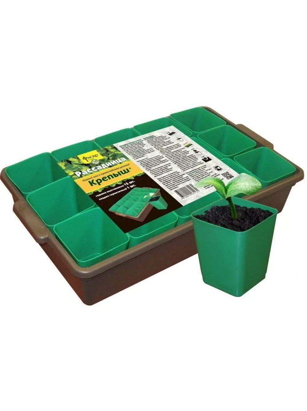 "Рассадница-кассеты для рассады состоит из герметичного поддона и набора из 15 пластиковых горшков для выращивания рассады, комнатных растений и укоренение черенков.