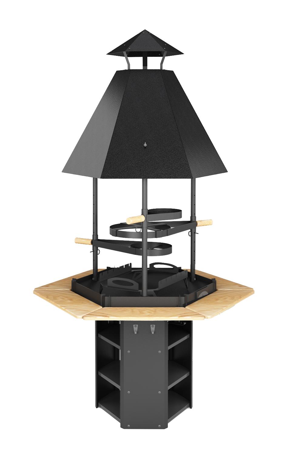 Гриль GRILLUX Suomi grill Coner ВЗР 2364 пригодится для приготовления мяса на открытом воздухе. Корпус изделия выполнен из нержавеющей стали и углеродистого листового металла. Поверхность покрыта термоустойчивой краской. Конструкция создана так, чтобы к очагу можно было подходить с любой стороны. Мясо выкладывают на регулируемых подставках или нанизывают на шампуры, которые размещают на съемном шашлычном модуле. Дым уходит в просторный купол с зонтиком. Крыша защищает угли и блюда от дождя. Шесть столиков для посуды обеспечивают комфорт во время приготовления деликатесов. Для чистки очага предусмотрен выдвижной зольник.