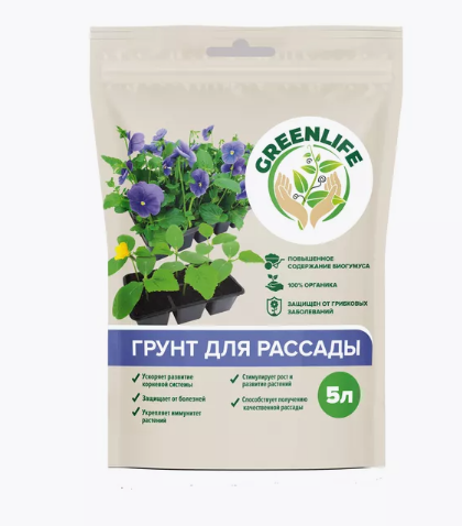 Грунт для рассады Грин Лайф • Ускоряет развитие корневой системы • Защищает от болезней • Стимулирует рост и развитие растений • Укрепляет иммунитет растений • Способствует получению качественной рассады Грунт для рассады GREEN LIFE предназначен для выращивания рассады овощных и цветочных культур, для пикирования рассады, для заполнения лунок при высадке рассады. Преимущества: Повышенное содержание биогумуса, полезной микрофлоры и природных биологически активных веществ стимулируют рост мощной корневой системы растений, повышают их устойчивость к неблагоприятным условиям окружающей среды, таким как засуха, заморозки и т.п. Грунт полностью защищен от грибковых заболеваний, т.к. содержит триходерму – гриб который выделяет природные антибиотики, обеззараживающие почву и обеспечивающие защиту от болезней (корневых гнилей, фуразиоза, фитофтороза и т.п.). Благодаря многоступенчатому физическому воздействию на грунт в нем остановлены все возможные патогенные процессы и активирована полезная микрофлора.