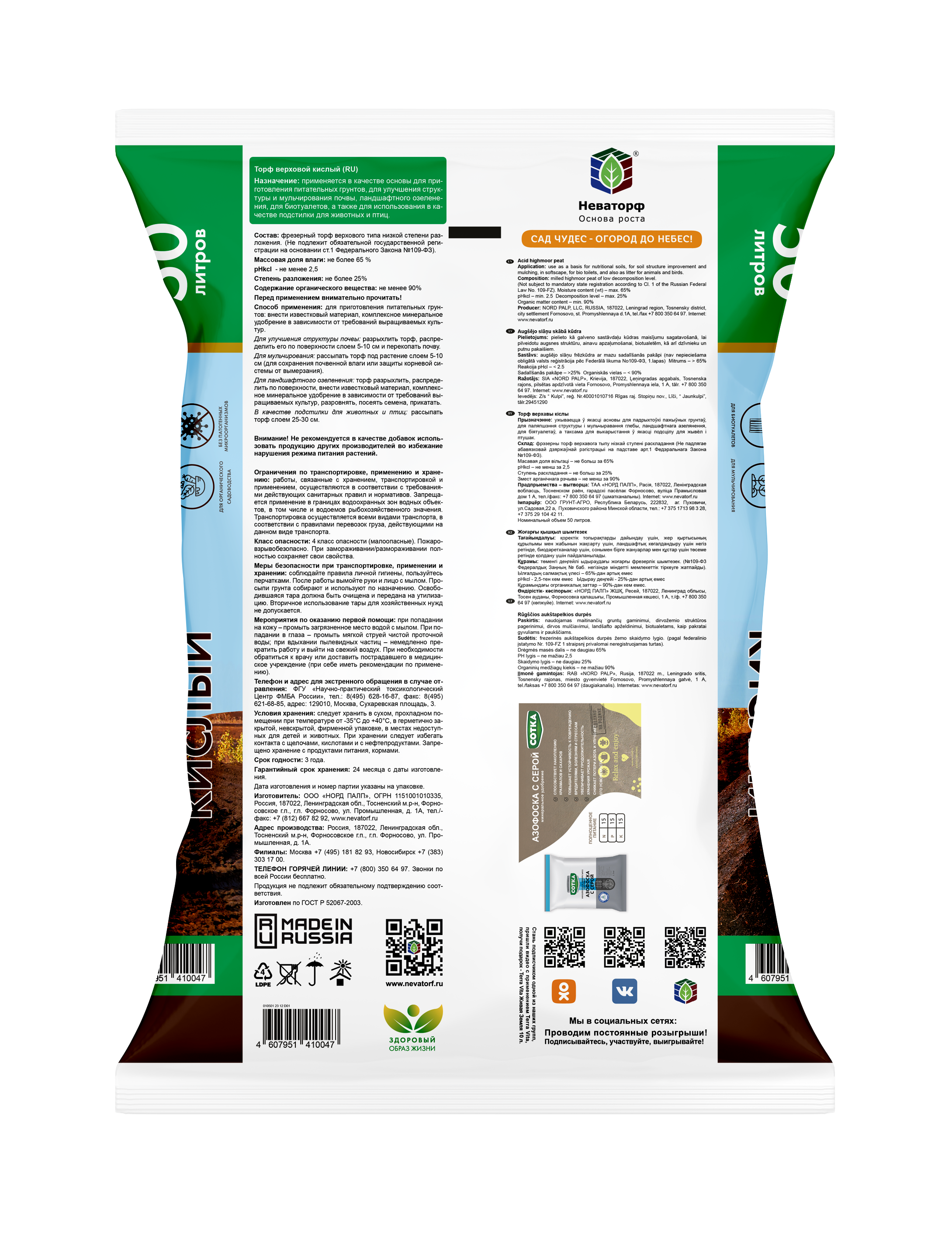 состав: фрезерный торф верхового типа низкой степени разложения. массовая доля влаги — не более 65 %, степень разложения — не более 25 %, содержание органического вещества — не менее 90 %. для приготовления питательных грунтов: внести известковый материал, комплексное минеральное удобрение в зависимости от требований выращиваемых культур.