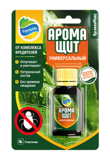 Аромащит - это органическое средство защиты растений для профилактики и борьбы с насекомыми-вредителями. - Контролирует и отпугивает насекомых-вредителей на протяжении длительного времени и обеспечивает защиту растений - Уникальная комбинация натуральных ингредиентов убивает насекомых-вредителей - Натуральный состав из компонентов высшего качества на основе эфирных масел растений без синтетических ингредиентов - Можно использовать на съедобных культурах до дня сбора урожая - Безопасен для человека и животных Аромащит это препарат на основе натуральных эфирных масел растений. Эфирные масла представляют собой вторичные метаболиты, синтезируемые растениями, физиологически важные для таких функций, как передача сигналов, привлечение опылителей, аллелопатия, адаптация к абиотическим стрессам, защита от патогенов и фитопатогенных насекомых.