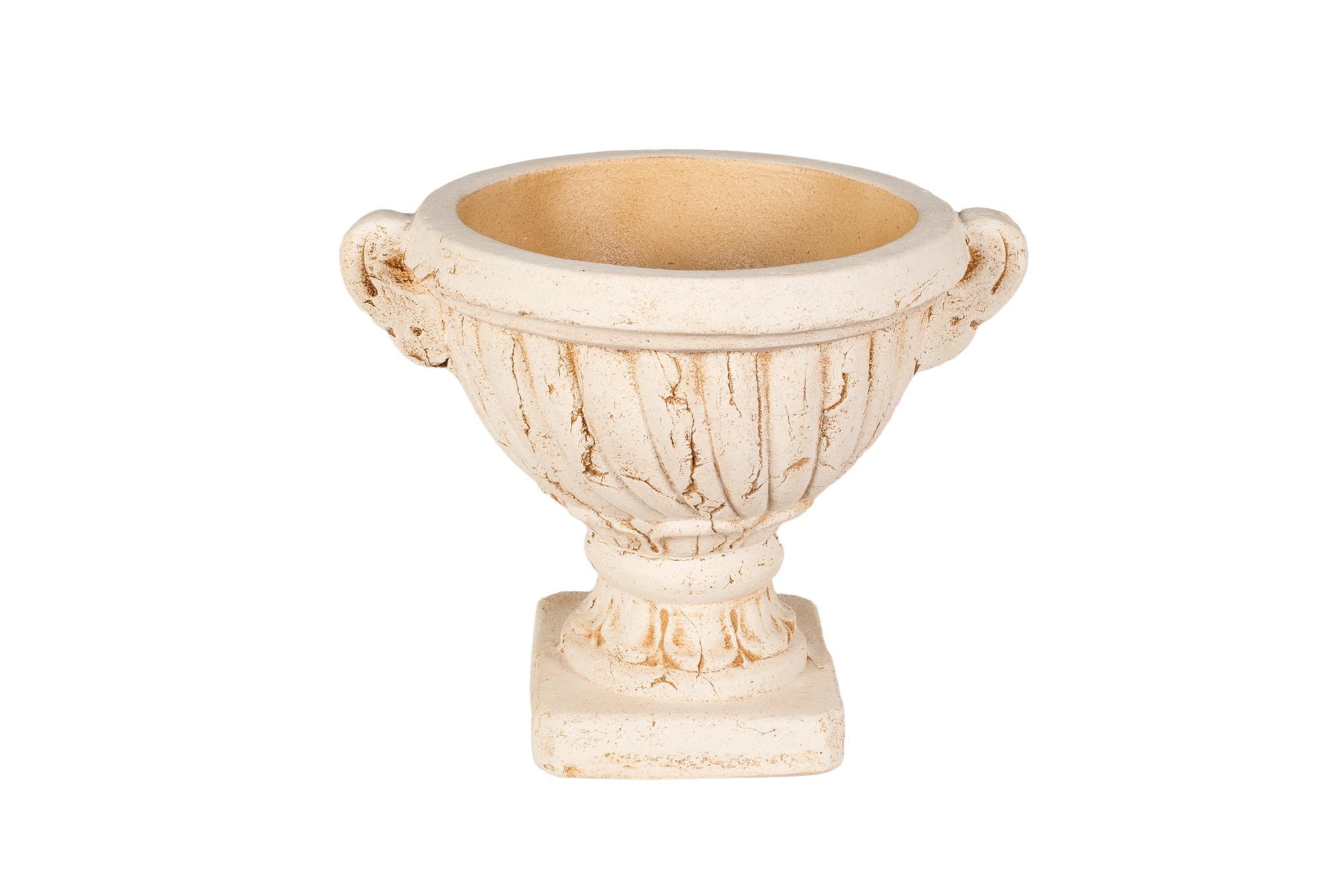 Вазон для сада изготовлен из шамотной глины высокотемпературного обжига. Изнутри покрыт специальной кварцевой глазурью. Выполнен в бежевом цвете. Декорирован узорами из линий, имитирующими лёгкие трещинки под старину и рельефными вертикальными полосами имитирующими лепестки цветка. Горшок по форме напоминает большую чашу с небольшими ручками и имеет устойчивое квадратное основание.Керамический вазон для сада Вазон малый выполнен в виде кубка с небольшими ручками по краям. Имеет устойчивое квадратное основание, может быть установлен на открытой ровной площадке. Например, во внутреннем дворе, вымощенном плиткой, или на верхнем основании декоративной колонны. Благодаря толстым стенкам и симметричной конструкции, вазон устойчив – защищен от случайных падений. Выполнен в благородном бежевом цвете, который гармонирует с любым интерьером. Прекрасно подойдёт для украшения холлов больших помещений: гостиниц, театров, студий, музыкальных центров.