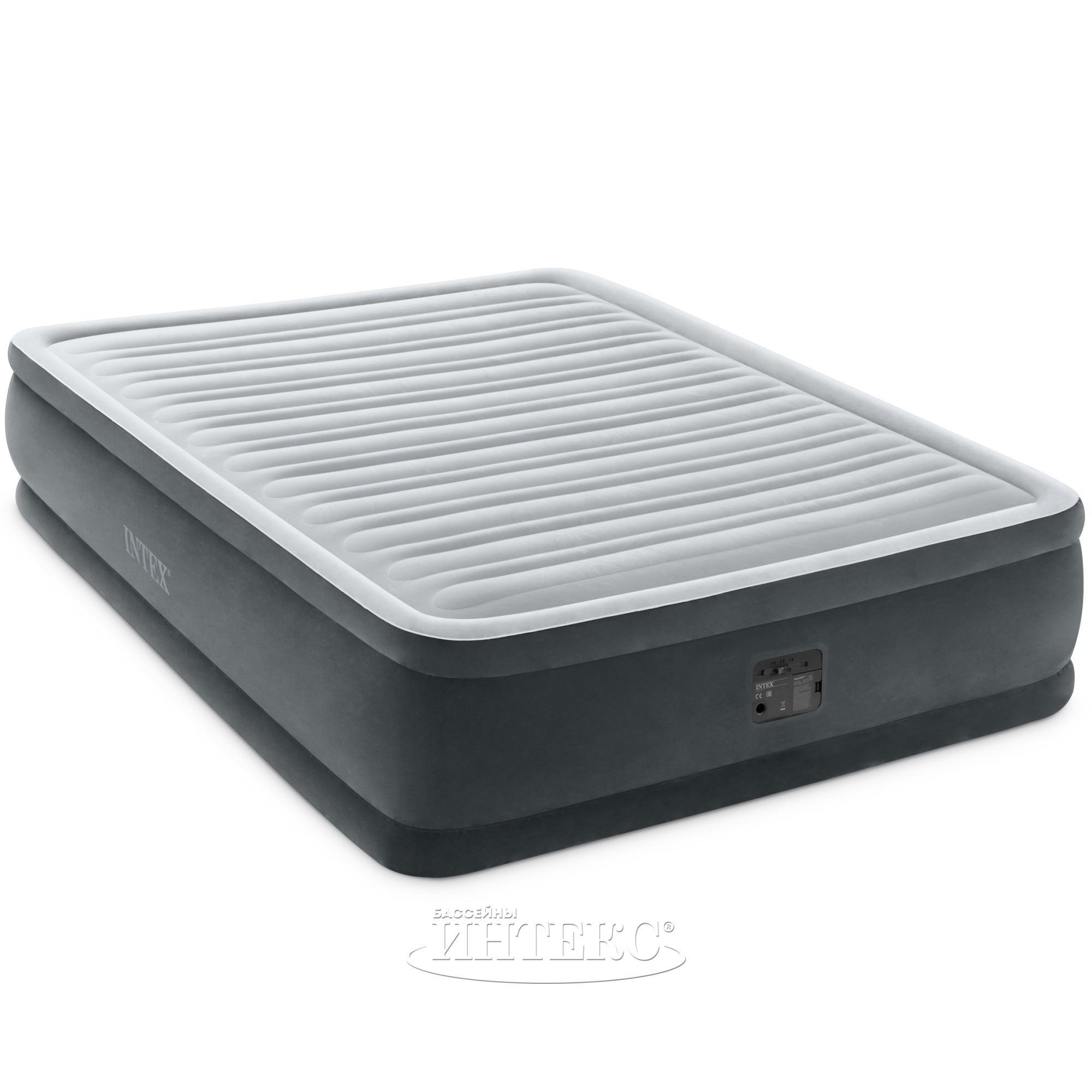 Надувная двуспальная кровать Queen Comfort-Plush Elevated Airbed со встроенным насосом ТМ Интекс (арт. 64414) - отличный выбор для ценителей комфорта! Верхняя часть выполнена в сером цвете и очень приятна на ощупь за счет флокированной поверхности, делающей ее похожей на бархат. Лежать на ней очень комфортно! Поверхность водостойкая и легко очищается от загрязнений, на ней не скользит постельное белье и подушки. Боковые стенки выполнены в темно-сером цвете.