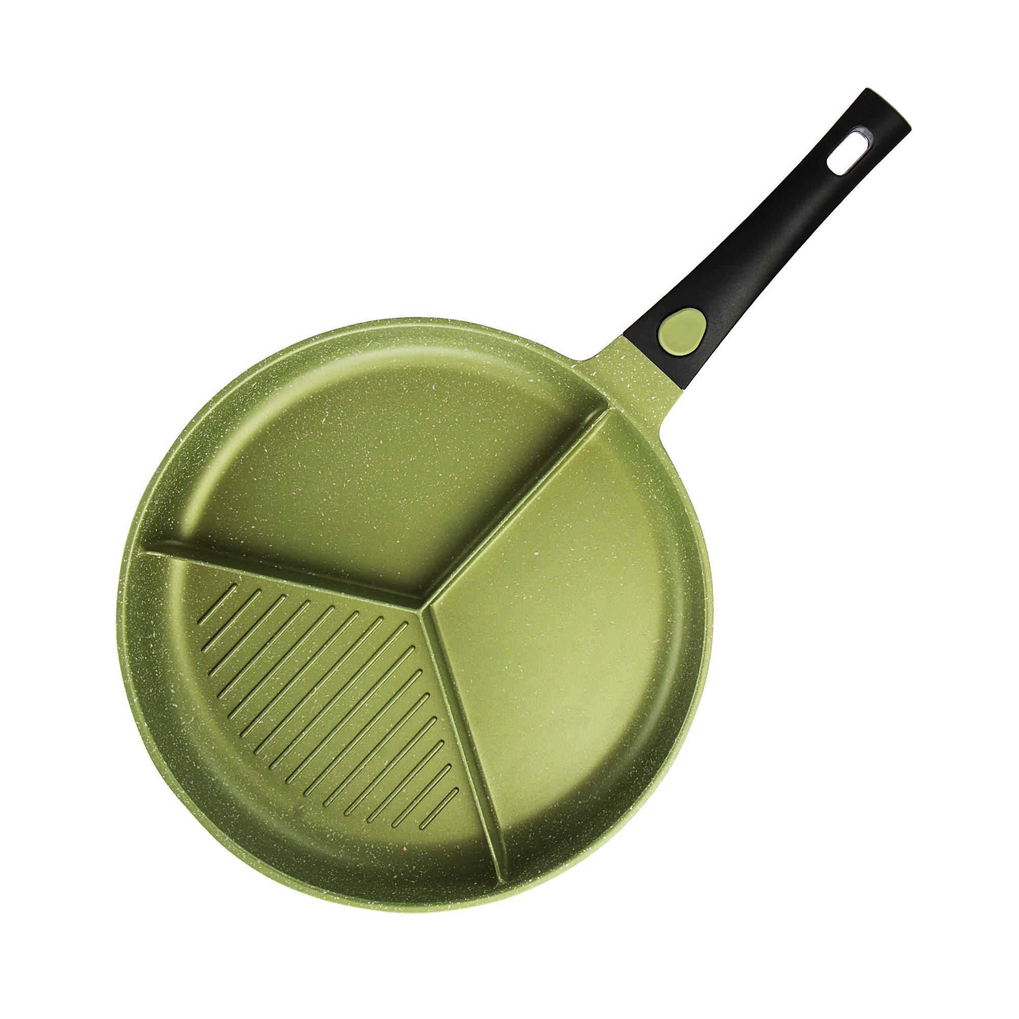 Со сковородой Millman от Kitchenstar Вы будете тратить гораздо меньше времени на готовку, чем раньше. Три равных отсека позволят Вам одновременно приготовить сразу несколько разных продуктов. Такая сковорода отлично подойдет, например, для традиционного английского завтрака. В одном отсеке – яичница, в другом – бекон, а в третьем – фасоль. Сковорода изготовлена из экологичных материалов без вредных веществ. На антипригарном покрытии, устойчивом к царапинам, можно жарить без сливочного и растительного масла. Сковорода Millman сэкономит Ваше время и сделает трапезу вкусной и полезной.