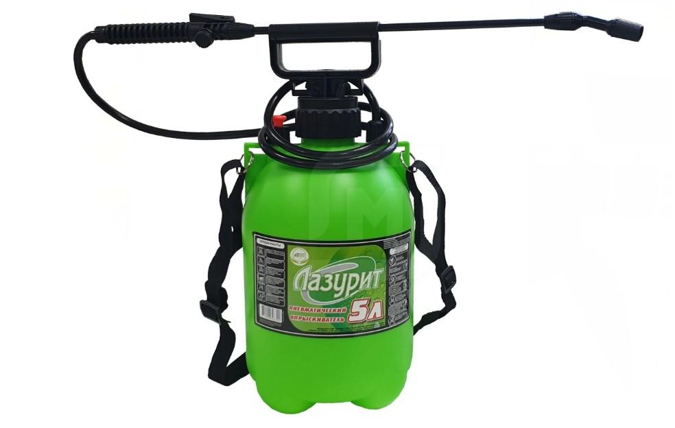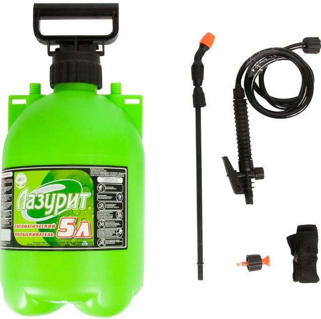 Опрыскиватель «Лазурит» пневматический предназначен для распыления жидких растворов удобрений, растворов химикатов для борьбы с вредителями и болезнями растений, а также для дезинфекционных работ. Распыление жидкости происходит под давлением 0,1–5 бар. Полипропиленовый корпус диаметром 180 мм имеет объем 5 л, устойчив к воздействию ультрафиолета. Шланг длиной 1,13 м изготовлен из ПВХ.