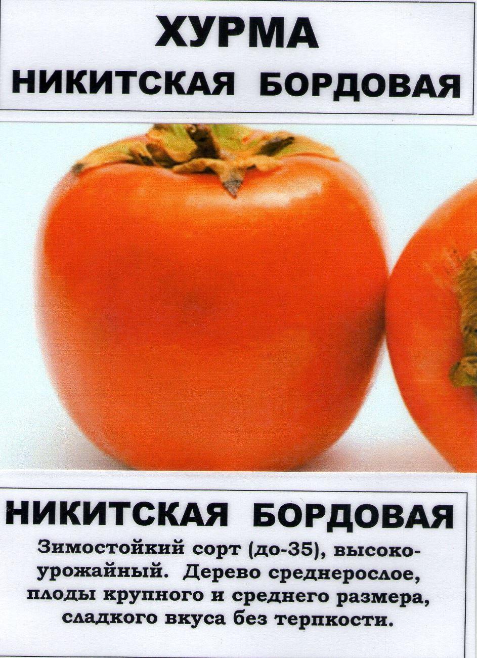Сорт относится к группе константных. Двудомная форма. Прекрасное видом, листвой и своей грациозностью с аккуратной округло-пирамидальной кроной дерево. Высота дерева средняя. Образует только женские цветки, склонна к партенокарпии, самостоятельное плодоношение от цветения 20-30%. Не опыленные цветочки осыпаются. Поэтому для хорошего опыления нужны сорта опылители. Мы предлагаем опылители с обильным плодоношением, это сорта «Божий дар» или опылитель плодоносящий (универсальный). Дерево сорта «НИКИТСКАЯ БОРДОВАЯ» средней силы роста, в 10-летнем возрасте высотой 3,8 м, шириной - 2,3 м. Крона округло-пирамидальной формы. Листья плотные, сверху темно-зеленые, снизу – зеленые. Длинной 16 см, шириной 10 см. Масса плода до 130 г., форма плодов этого сорта хурмы , округло-плоская. Красно-оранжевого цвета с восковым налетом , который ярко выражен пока плод твердый, зрелый – бордового цвета. Мякоть повидло образная, бордово-красная, сладкая.