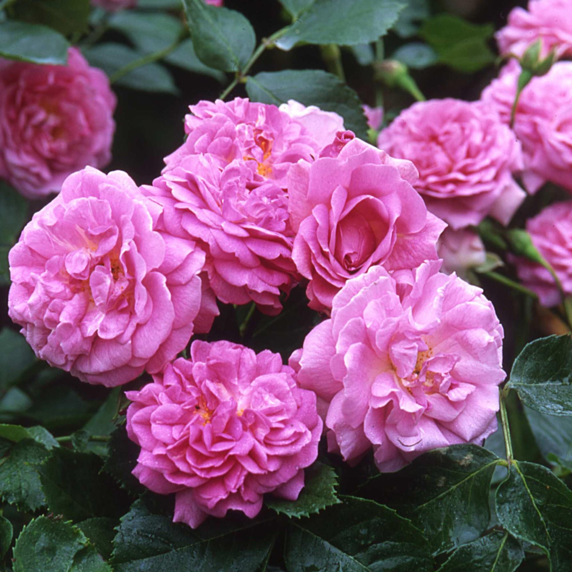 Цветки сиренево-розовые, ближе к розовому, чем лавандовому. Цветение махровыми (20-25 лепестков), диаметром 7-8 см, в форме розетки цветками, собранными в грозди. Обильно цветёт ранним летом, и затем к осени. Цветы ароматные, имеют легкий сладкий запах.