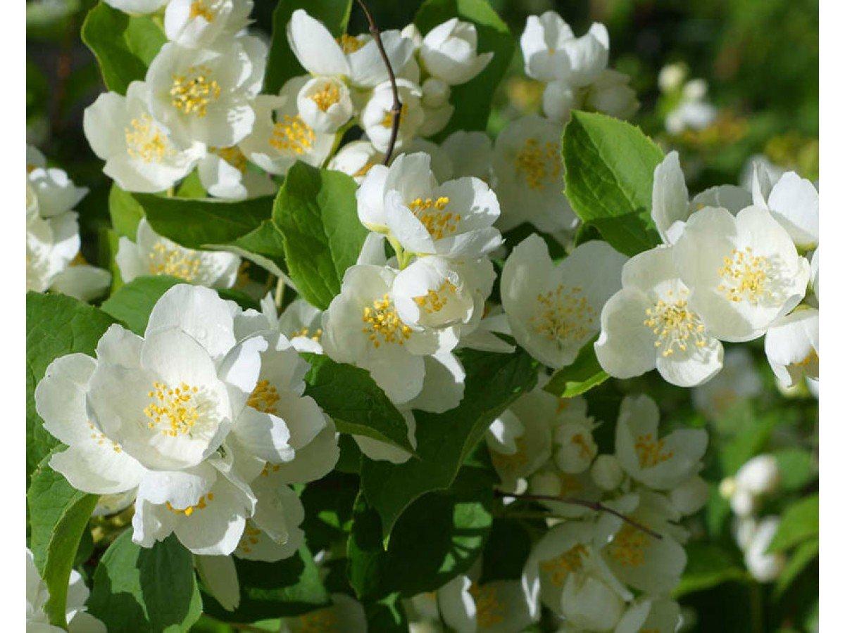 Жасмин садовый (Чубушник) - принадлежит к наиболее популярным садовым растениям. Он обильно цветет белыми или кремово-белыми душистыми цветками. Листья овальные светло-зеленые, цветки достигают в диаметре 2-4 см. Очень вынослив: может расти практически в любых условиях. Нуждается в ежегодной обрезке.