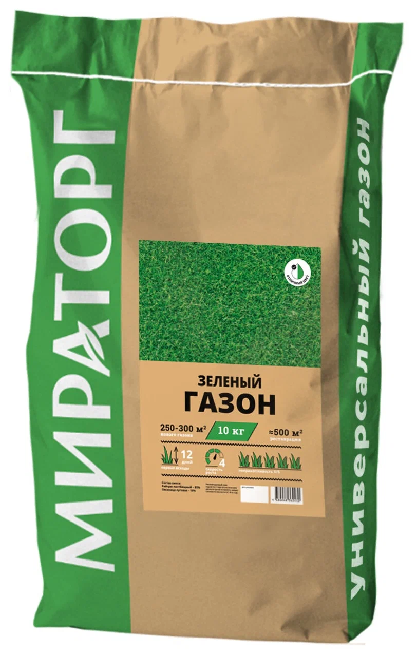 Семена газона Мираторг Зеленый газон 10 кг - универсальная травосмесь. Газон неприхотлив в уходе, благодаря чему идеально подойдет, когда требуется экспресс озеленение или ремонт газона. Смесь не требует частого полива и это значительно облегчает уход за ней.Травосмеси находят широкое применение в городском и дорожном, загородном и приусадебном озеленении, создании спортивных газонов. Газонные травосмеси отвечают высоким требованиям: устойчивость к неблагоприятным условиям окружающей среды, быстрое отрастание после частого скашивания, устойчивость к вытаптыванию, засухоустойчивость, зимостойкость.