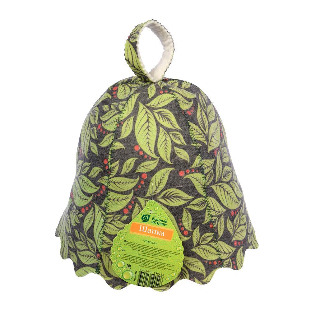 Шапка листья Банные штучки войлок 100%. Шапка Листья для бани и сауны классической формы понравится любителям банных процедур, а яркий дизайн шапки не оставит равнодушных. Хорошая банная шапка защитит волосы и голову от перегрева и позволит получить от бани только приятные ощущения и положительные эмоции. Шапка из войлока долговечна, прекрасно сохраняет форму, устойчива к стирке и деформации.