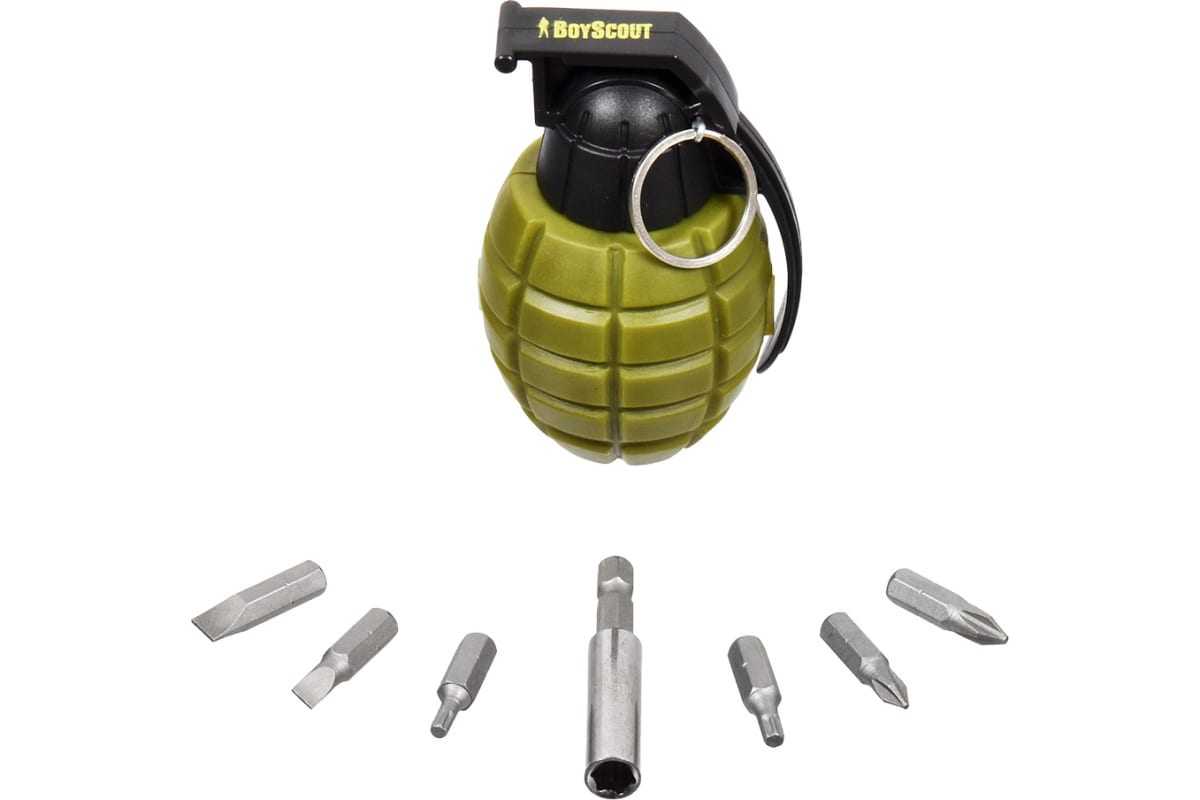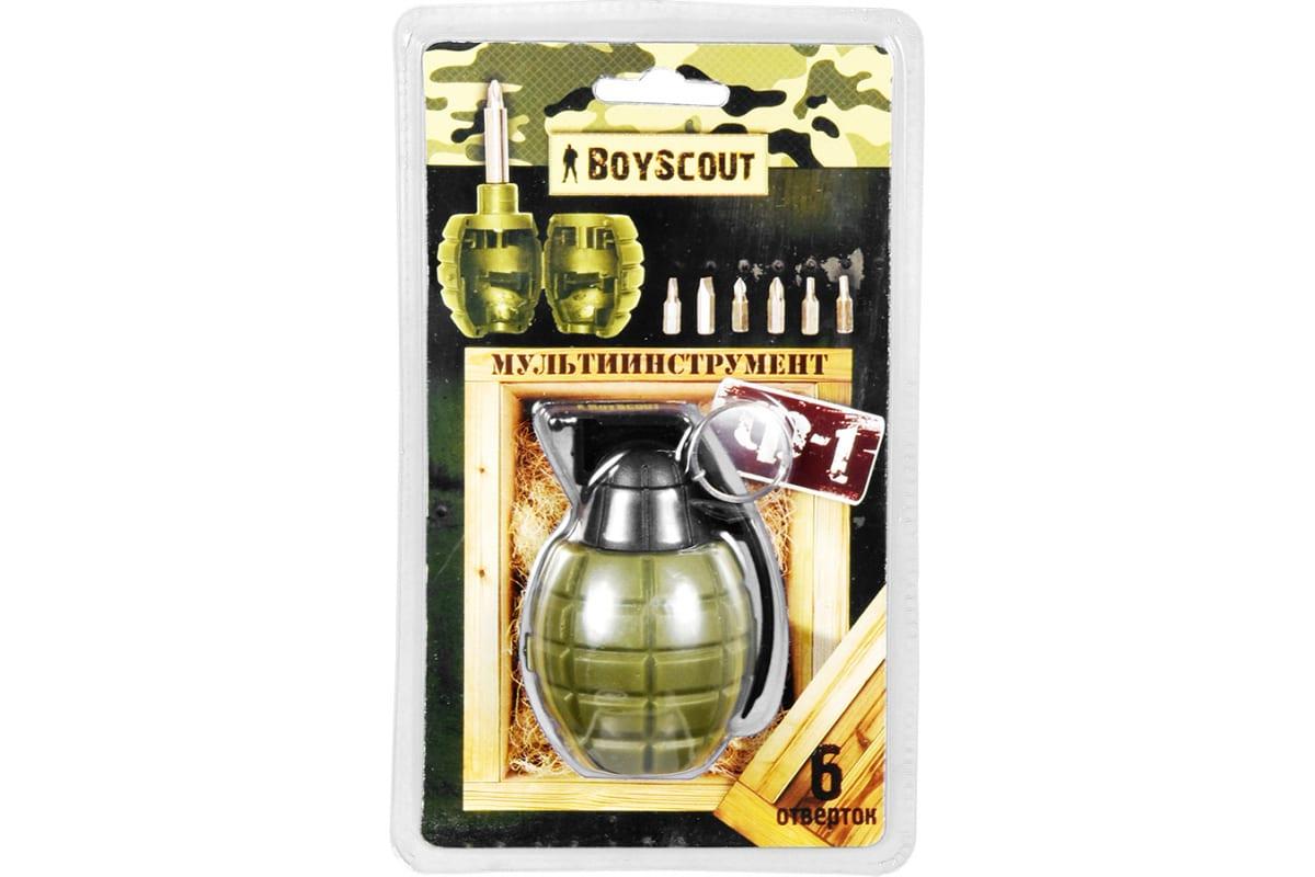 Мультиинструмент BOYSCOUT Ф-1 6 функций предназначен для дома и дачи. Он выполнен в виде гранаты с кольцом для подвески на ключи. В комплекте поставляется шесть бит и один магнитный адаптер-удлинитель. Изделия изготовлены из прочной углеродистой стали.