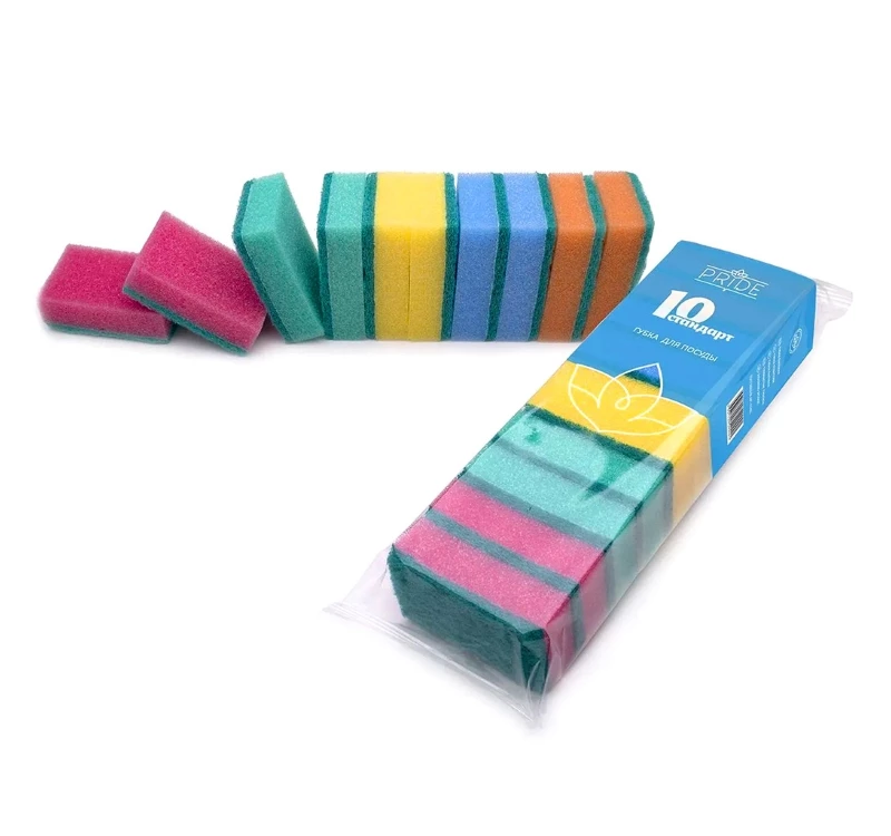 Губки поролоновые, с абразивом,10 шт. Бытовые губки для мытья посуды, раковин, плит и варочных поверхностей. Изготовлены из высококачественного поролона и абразива. Мягкий поролоновый слой для деликатного мытья, жесткий абразивный используется для сильных загрязнений. Губки сохраняют форму в течение всего срока службы.