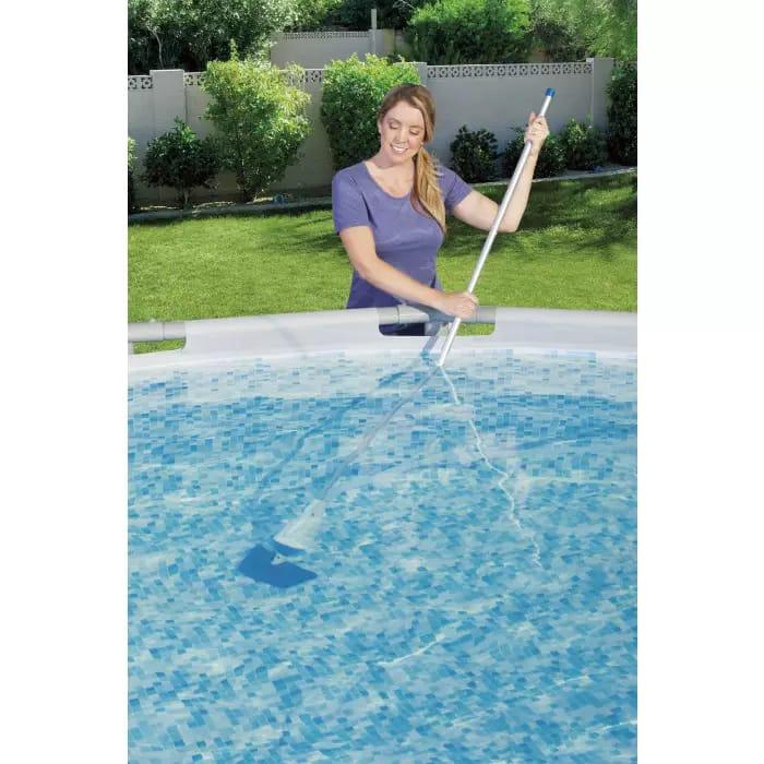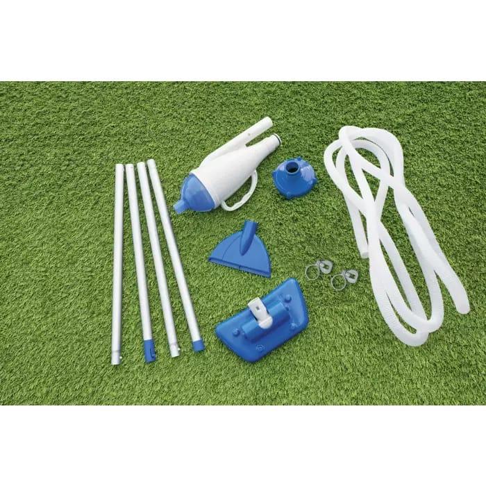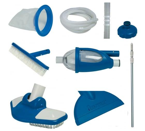 Набор для чистки бассейна INTEX 28003 включает в себя высокоэффективные в работе приспособления для поддержания чистоты воды, дна и стенок бассейна. К набору прилагается шланг для подключения к фильтрующему насосу. Для работы нужен фильтрующий насос с минимальной производительностью - 3028л/ч. Насадка в виде щетки пылесоса крепится к фильтру-насосу через прилагающийся фильтр. Вода вместе с загрязнениями всасываются фильтром с дна, на сетке скиммера задерживается крупный мусор. Затем вода проходит через фильтрующий насос обратно в бассейн. Набор подходит для чистки бассейнов диаметром до 6 метров.