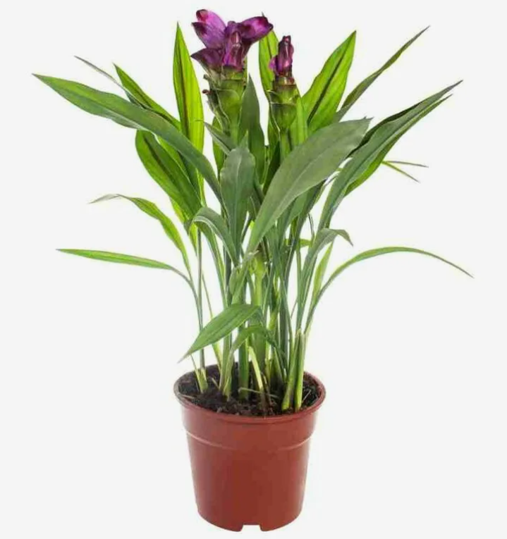 Куркума – травянистое растение, которое принадлежит к семейству Имбирных. Благодаря своим уникальным вкусовым качествам растение получило второе название – индийский шафран. В естественной среде обитания биологи насчитывают более 35 видов данного цветка. Широкие листья темно-зеленого цвета имеют длинные черешки и ровные края. Бледные цветки расположены на длинных цветоносах и имеют яркие прицветники. Цветы собраны в соцветие, диаметр которого может достигать более 20 см. Взрослое и здоровое растение во время цветения формирует несколько цветоносов. Период цветения начинается в июле и заканчивается в октябре. Цветущее растение выглядит очень эффектно и может стать украшением любой оранжереи. Высота: 50-80 см.