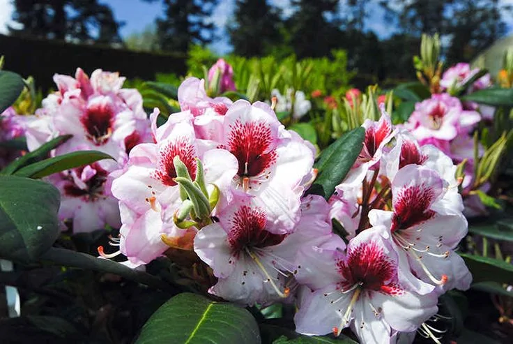 Рододендрон (Rhododendron) является представителем семейства Вересковые. Данный род представлен кустарниками и деревьями, которые бывают листопадными, полулистопадными и вечнозелеными. Согласно различным источникам данный род объединяет 800–1300 видов, в их число входят азалии, которые очень популярны у цветоводов, они еще именуются «комнатным рододендроном». В состав названия данного растения входят 2 слова: «rhodon», что переводится как «роза» и «dendron» ― означающее «дерево». В связи с этим рододендрон означает «дерево с розами», либо «розовое дерево». Дело в том, что цветки азалий внешне схожи с розами. В диких условиях наибольшее распространение рододендроны получили в Северном полушарии (в Южном Китае, Гималаях, Юго-Восточной Азии, Японии и Северной Америки). Они предпочитают расти в прибрежной зоне морей, рек и океанов, на северных склонах гор и в полутени подлесков. Отдельные виды в высоту достигают 0,3 м, а другие являются стелющимися кустарниками.