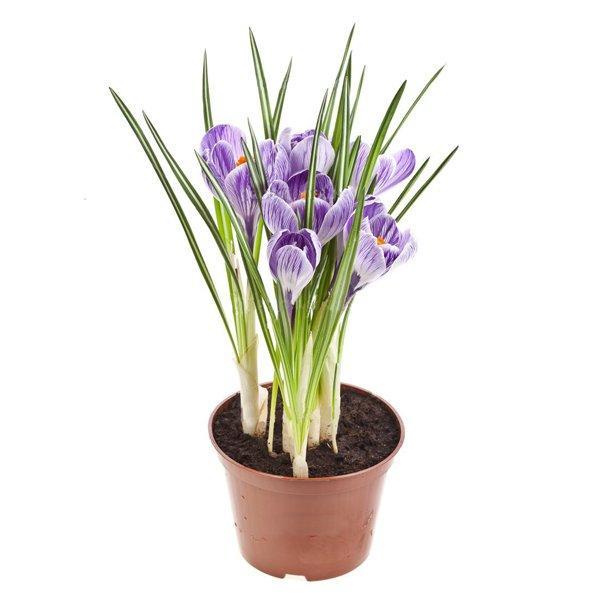 Крокус весенний (Crocus vernus). Это один из самых распространенных видов, в диком виде он встречается почти по всей Европе. Цветки у него имеют форму воронки, лепестки окрашены в белый либо лиловый цвет. Цветет в апреле чуть более 2 недель. Высота цветоносов – до 15 см.