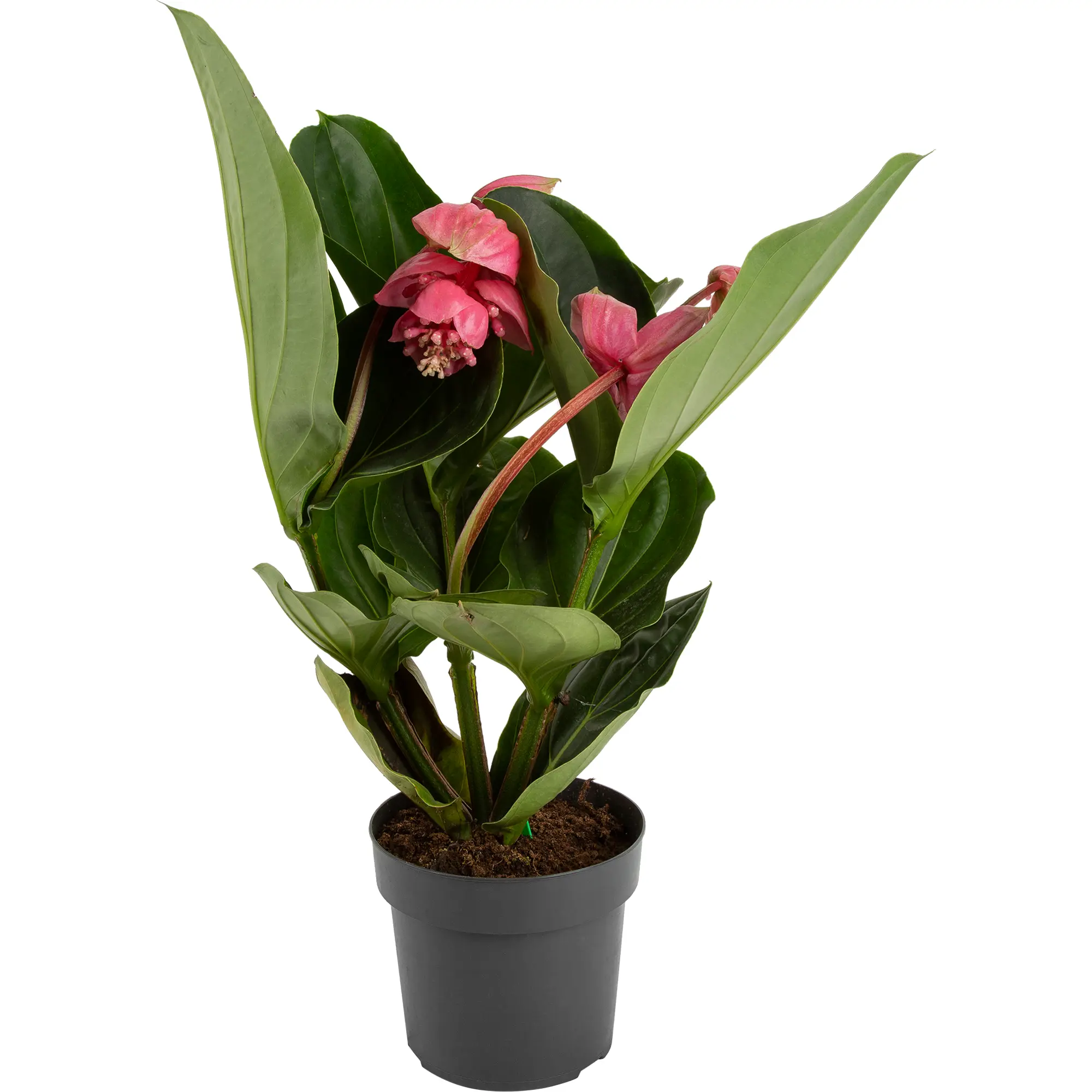Мединилла магнифика d19 h60 - тропический цветок с крупными кожистыми листьями на мясистых стеблях. Чашевидные цветы образуют кистеобразные соцветия длиной до 30см. Домашняя мединилла достигает роста 70-100см. Цветение продолжительное с конца апреля до середины июля. Растение сохраняет декоративный вид независимо от цветения.
