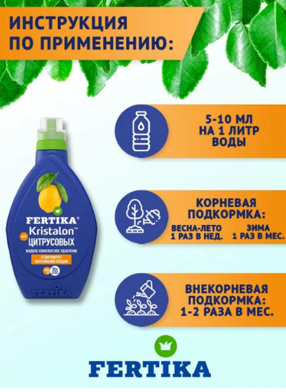 Комплексное удобрение Fertika / Фертика Kristalon для цитрусовых 250мл. Для подкормки всех видов цитрусовых (лимон, апельсин, грейпфрут, цитрон). Обеспечивает интенсивное развитие корневой системы растений, хорошее плодоношение, накопление в плодах сахаристых веществ и витаминов. Повышает интенсивность окраски листьев. Продлевает срок службы грунта горшечных культур. Нормы и способы внесения: 5 -10 мл развести в 1 литре воды и этим раствором поливать растения весной - летом 1 раз в неделю, а зимой - 1 раз в месяц. Некорневые подкормки (опрыскивание по листьям, избегая попадания раствора на цветок и плоды) - 1-2 раза в месяц.